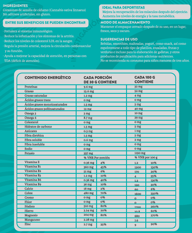 DATO CURIOSO: las semillas de hemp son excelente fuente de fibra soluble e insoluble que favorecen los niveles de glucosa en la sangre y benefician a personas que padecen de colesterol elevado.