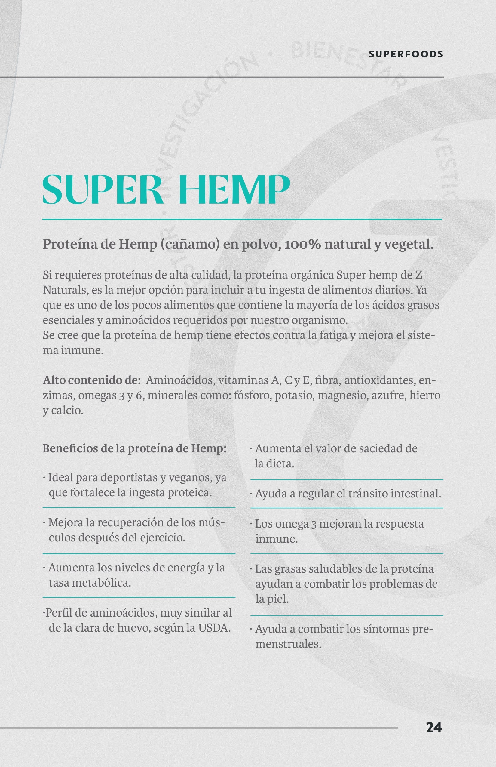 Obtenga proteínas de alta calidad con la proteína orgánica Super HEMP de Z Naturals. Contiene una gran cantidad de ácidos grasos esenciales y aminoácidos escenciales que benefician a tu organismo, como mejorar el sistema inmunológico y luchar contra la fatiga. Además, es rico en vitaminas A, C y E, antioxidantes, omega 3 y 6 y minerales esenciales como fósforo, potasio, magnesio, calcio y más.